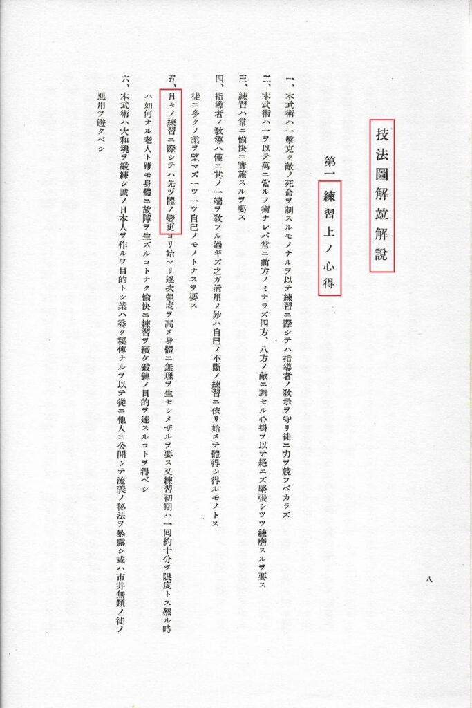 心得 ცოდნას, ინფორმაციას, სწავლას ნიშნავს და არავითარ შემთხვევაში სიფრთხილესა და სიფხიზლეს. ჯონ სტივენსი კი ამ სათაურს თარგმნის, როგორც სიფრთხილის გამოჩენა ვარჯიშის დროს (Precautions for training). ამგვარი მოქმედებით ის თვითნებურად ამახვილებს ყურადღებას ვარჯიშის უსაფრთხოების პირობებზე და საერთოდ უგულებელყოფს 心得-ის შინაარსს. მაგრამ თუკი უსაფრთხოება ვარჯიშის დროს აუცილებელია, სტივენსის მიერ წინ წამოწეული სიფრთხილე სრულებითაც არ არის ო-სენსეის მითითებების მთავარი საზრუნავი, და თარგმანი მითითებები ვარჯიშისთვის, რაც ზუსტად შეესაბამება იაპონური ტექსტის შინაარსს, აშკარად უმჯობესი უნდა იყოს.