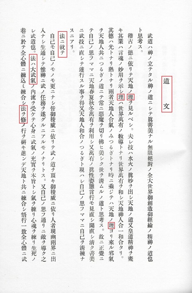 ო-სენსეი გზის მოწესრიგებულ და რაციონალურ ხასიათს ხაზს უსვამს და ამ ლოგიკით ასევე სამჯერ იყენებს ამ გვერდზე კანჯის 法 (ჰო), რომელსაც აქ კანონის მნიშვნელობა აქვს ისეთ გამოთქმებში, როგორებიცაა კანონის დაცვა (法二就テ), ანდა კანონის გამოყენება პრაქტიკაში (法チ修), და კიდევ ამ გამოთქმაში, რომლის თარგმნაც რთულია პერიფრაზის გარეშე, მაგრამ რომლის შინაარსიცაა: კანონი საბრძოლო ხელოვნებებში ჩამალული დიდი სულიერი ძალაა. როგორც ჩანს, ო-სენსეი აქ სიტყვებით თამაშობს, რათა აჩვენოს, რომ არ შეიძლება ავურიოთ ორი რამ, რასაც ერთმანეთთან საერთო არა აქვს: ერთი მხრივ, ბუკი (武器) იარაღი და, აქედან გამომდინარე, კონფლიქტი, ომი, განადგურება და, მეორე მხრივ, ბუკი (武氣) ჰარმონიის სულისკვეთება, რომელიც კვებავს და აცოცხლებს საბრძოლო ხელოვნებას. 武器 და 武氣 მართლაც ერთნაირად წარმოითქმის: ყველა ლექსიკონში შეხვდებით იარაღების „ბუკის“, მაგრამ ვერცერთში ვერ ნახავთ ბუდოს ბუკის. ეს გამოთქმა აქ ო-სენსეიმ შექმნა იმ მესიჯის შემოსატანად, რომელიც მისი ტექსტის გაგრძელებაშია: