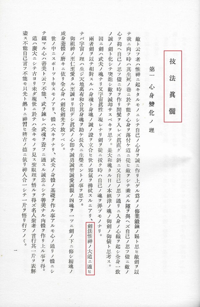 პროლოგს მოსდევს შესავალი. ინგლისური სათაური გვაუწყებს “The essence of technique”-ს და აქაც ამჯობინებს, რომ არ თაგმნოს კანჯი „კანონი“(法), რომელიც იაპონურ სათაურშია 技法眞髓 და რომელსაც ვხვდებით ფრაზაში 劍法惟神ノ大道ニ適ヒ (ხმლის კანონი ღვთიური მეთოდის შესაბამისია), რომლის დანახვაც ქვევით შეგვიძლია: