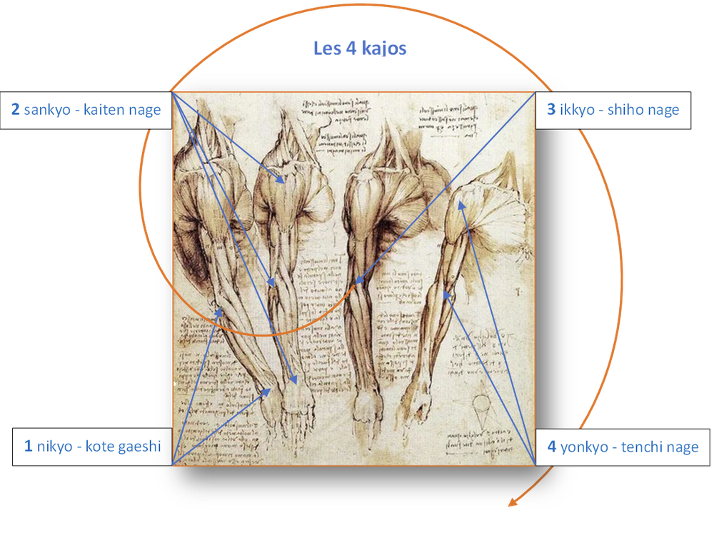კაჯოები ის ოთხი კანონია, რომლებიც ხელის სამი სახსრის გამოყენების წესს განსაზღვრავს. და ისევ ლეონარდო და ვინჩი გვაძლევს საშუალებას,  ეს ოთხი შესაძლებლობა ერთად და ნათლად ვიხილოთ ნახატზე, სადაც, საინტერესო დამთხვევაა და, მან იდაყვი თავდაპირველი ესკიზის ზუტად ცენტრში მოათავსა: