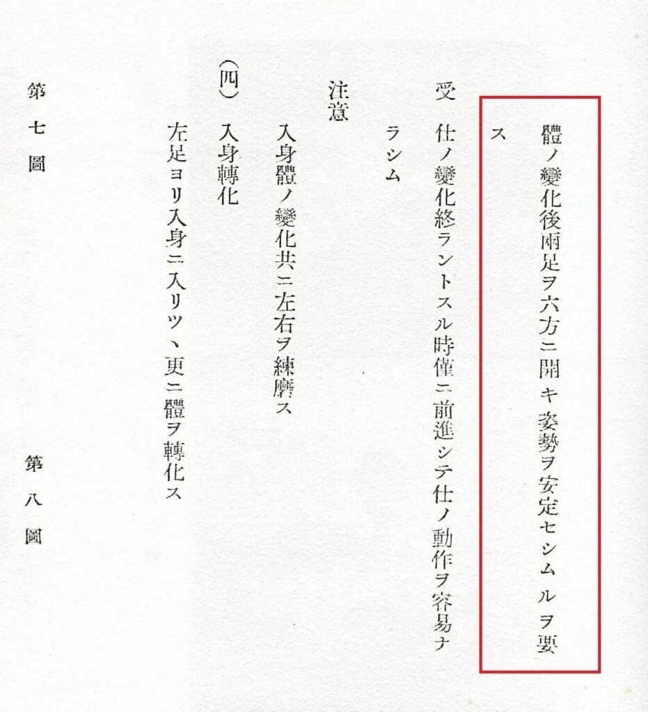 體ノ變化後 両足ヲ六方に開き姿勢ヲ安定セシマルを要ス – ამ ფრაზის ინგლისური თარგმანიც ისეთივე მაზალოა, როგორც წინა ფრაზებისა…